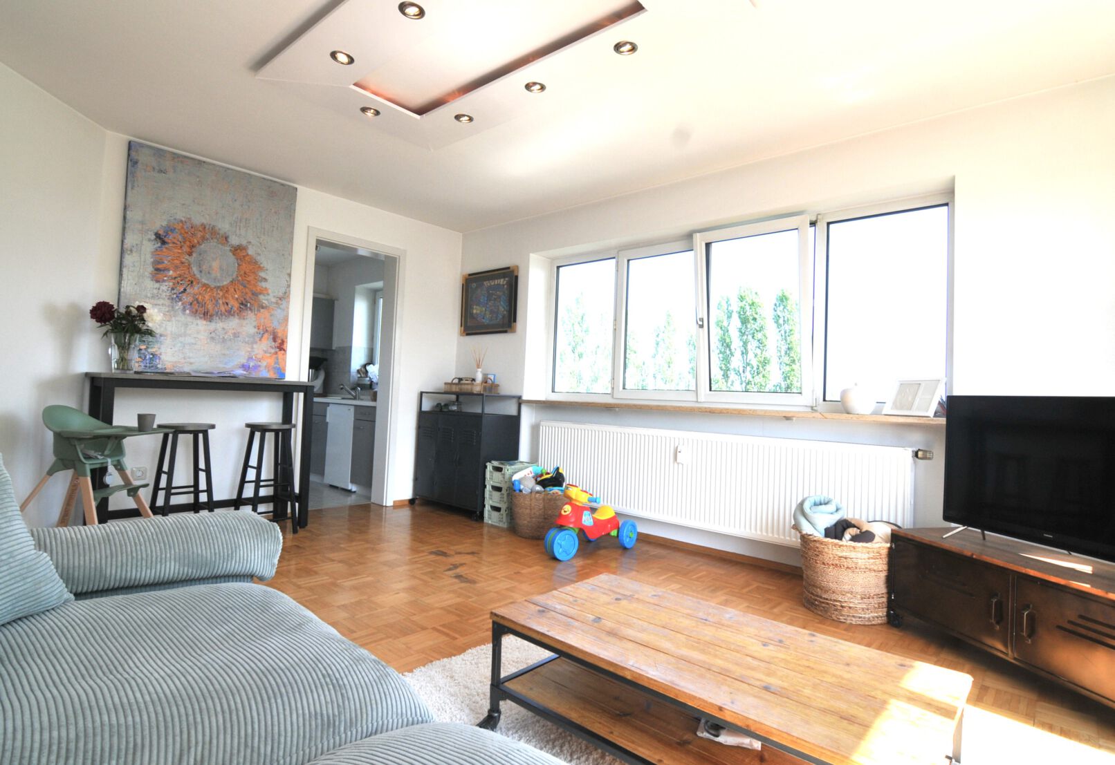 Die Einbauküche fügt sich nach Norden dem Wohnzimmer an. Der Blick ist von hier auch toll. Die Einbauküche ist gepflegt und praktisch. (Ablöse 2.000€)