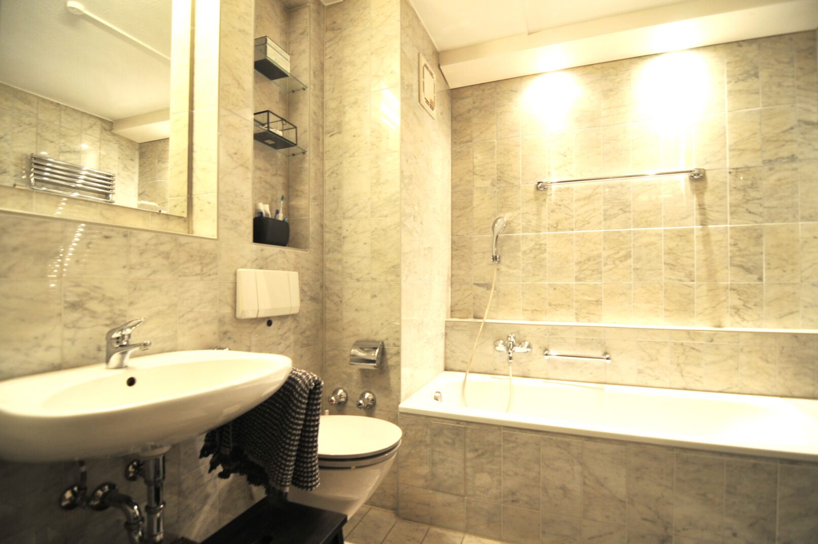 Das Bad verfügt über eine Wanne und eine Duschkabine. Die Waschmaschine hat hier auch angenehm Platz. Abstellmöglichkeiten gibt es auch ausreichend. Das Bad ist großzügig und ein angenehmer Ort.