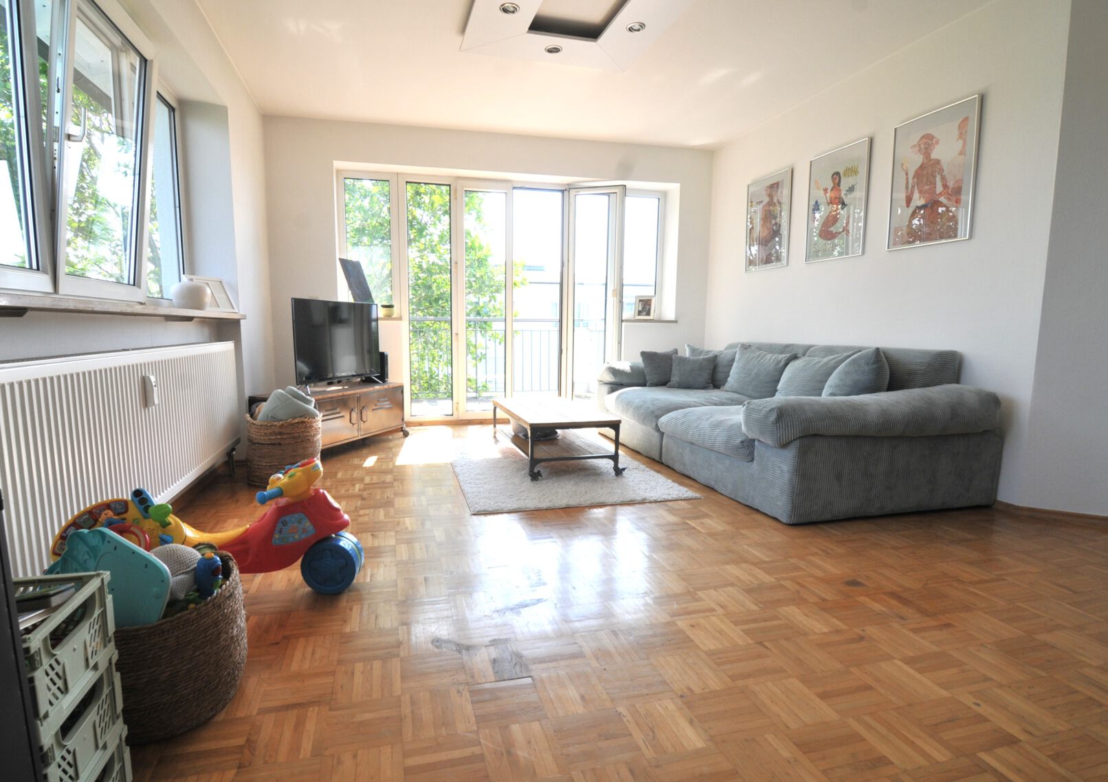 Im Wohnzimmer wurde ebenfalls Parkett verlegt wie auch in der Diele und dem Schlafzimmer. Hier ist Barfuß gehen angesagt.