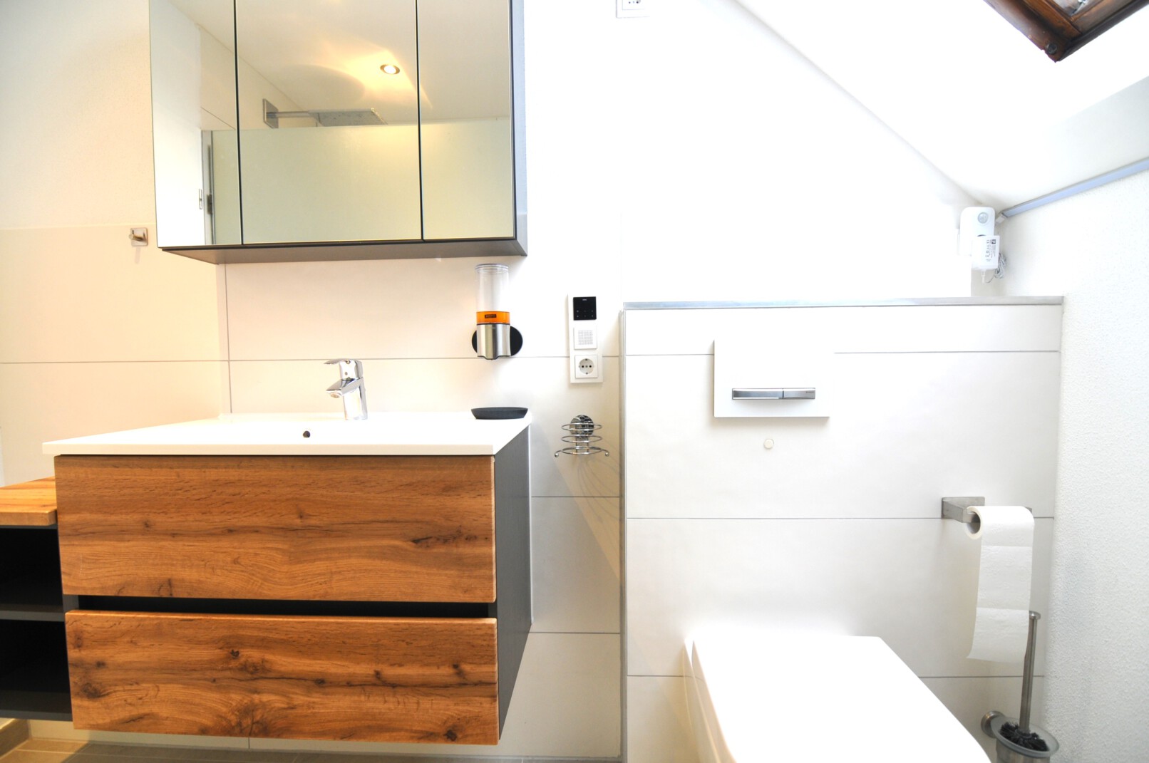 Das Tageslichtbad ist sehr schön eingerichtet mit Badmöbeln, großer Dusche, Fußbodenheizung und Raindance-Duschkopf.